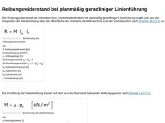 Der Reibungswiderstand bei Vortrieben bzw. Vortriebsabschnitten mit planmäßig geradliniger Linienführung ergibt sich aus der Integration der Mantelreibung über die Oberfläche der Vortriebs-/Schildmaschine und der Vortriebsrohre nach Formel 14.2.2.1 zu: (Formel: Berechnung des Reibungswiderstandes) Die Ermittlung der Mantelreibung basiert auf dem aus der Mechanik bekannten Reibungsgesetz nach Formel 14.2.2.1 : (Formel: Berechnung der Mantelreibung)