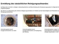 Auf Basis der im Schritt 1 erfolgten „Bestandsaufnahme und Beschreibung des Entwässerungssystems“ erfolgt die Erstellung von Inspektionsplänen. Sie dienen zur Überprüfung des örtlichen Ablagerungsverhaltens im Hinblick auf die Notwendigkeit und Planbarkeit von Reinigungsmaßnahmen. (Bild: Schachtinspektion Ablagerungen) Schachtinspektion durch Inaugenscheinnahme von oben (Bild: Schachtinspektion durch Inaugenscheinnahme und Spiegelung der Haltung) Schachtinspektion …