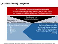 (Bild: Qualitätssicherung - Diagramm) Das hier dargestellte Diagramm zeigt den Zusammenhang zwischen den Leistungsindikatoren, der Beschreibung des Reinigungsergebnisses und den Beurteilungsmethoden. Wichtig: Die Überprüfung der Reinigungsleistung führt zu einer Verbesserung der Reinigungsstrategie und des Reinigungsplans. Grundsätzlich sollte die Reinigungsstrategie regelmäßig überprüft und auf der Grundlage von Informationen aus früheren Reinigungen …