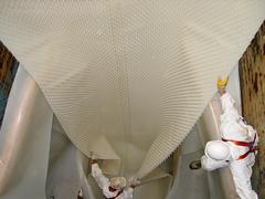 Die durch den Trommelwechsel entstandenen Profilstöße müssen nachbearbeitet werden. Die dadurch entstandenen Fugen werden ebenfalls mit PU-Schaum ausgeschäumt, das umgebende Wickelrohr mit dem Winkelschleifer aufgeraut und der Stoßbereich anschließend mit Epoxidharz getränkten Matten überlaminiert.
