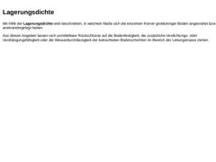 Bei der lockersten Lagerung können die Bodenkörner gegeneinander verschoben werden. Die dichteste Lagerung entspricht der natürlichen Lagerung von Einkornböden. Hier ist der Boden fest wie Fels; ein Verschieben der Bodenkörner ist nur … |