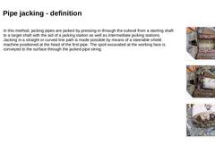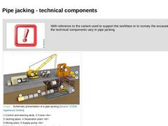 | (Image: Attention!) With reference to the variant used to support the workface or to convey the excavated soil the technical components vary in pipe jacking. | | (Image: Schematic presentation of a pipe jacking) |