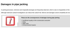 | In jacking processes, extensive and irreparable damages are frequently observed, which is due to irregularities of the subsoil. Although extensive subsoil investigations can reduce the subsoil risk, failures and damages cannot completely be excluded. | | (Image: Attention!) | These are the consequences of damages during pipe jacking: - Insufficient quality of the construction execution