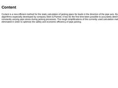 CoJack is a new efficient method for the static calculation of jacking pipes for loads in the direction of the pipe axis. By means of algorithms especially developed by company Stein & Partner, it has for the first time been possible to accurately determine the constantly varying pipe stress during jacking processes. The rough simplifications of the currently used calculation methods are eliminated in order to optimise the safety and economic efficiency …