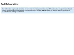 Soil deformation is generally defined as the horizontal or vertical positional change of the soil surface or a point inside the soil. Vertical soil deformation in the direction of the ground surface is called heaving and in the opposite direction is referred to as subsidence, settling or settlement.