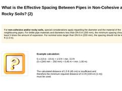 For non-cohesive and/or rocky soils, special considerations apply regarding the diameter and the material of the neighbouring pipes. For brittle pipe materials and diameters less than DN 8 in (200 mm), the minimum spacing should be at least 5 times the amount of expansion. For nominal sizes larger than DN 8 in (200 mm), the spacing should not be less than 3.3 ft (1.0 m). Example calculation: 5 x (13 in - 10 in) = 1.5 ft < min. …
