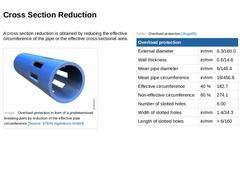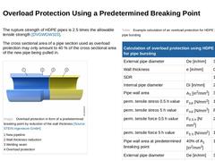 The rupture strength of HDPE pipes is 2.5 times the allowable tensile strength [DVGWGW323]. The cross sectional area of a pipe section used as overload protection may only amount to 40 % of the cross sectional area of the new pipe being pulled in. (Image: Overload protection in form of a predetermined breaking point by reduction of the wall thickness) (Table: Example calculation of an overload protection for HDPE 100 used in pipe bursting)