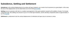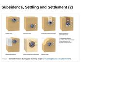 Subsidence is the vertical displacement of an entire soil layer (stratum), as a result of soil movement at a great depth. In this case, the size of the displacement can be determined, but not its timing [Schmi96]. Settling occurs in granular soils due to a sudden rearrangement of the grain particles caused by the addition of water. For loosely compacted soils, this settling can amount to up to 5 % of the layer thickness, and for densely compacted …