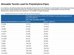As a reference, the following table shows the allowable tensile forces for PE 100 pipes for a load duration of 30 minutes (according to the German DVGW working sheet GW 323: Trenchless replacement of gas and water supply pipelines with pipe bursting; Requirements, quality assurance and inspections / not available in English at present). (Table: Allowable tensile forces for PE 100 pipes under a 30 min load)