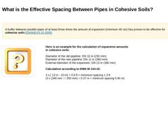 A buffer between parallel pipes of at least three times the amount of expansion (minimum 40 cm) has proven to be effective for cohesive soils [DWAM143-15:2005] Here is an example for the calculation of expansion amounts in cohesive soils: Diameter of the old pipeline: DN 10 in (250 mm)