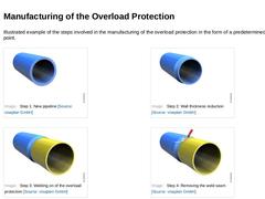 Illustrated example of the steps involved in the manufacturing of the overload protection in the form of a predetermined breaking point. (Image: Step 1: New pipeline) (Image: Step 2: Wall thickness reduction) (Image: Step 3: Welding on of the overload protection) (Image: Step 4: Removing the weld seam)