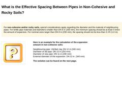 For non-cohesive and/or rocky soils, special considerations apply regarding the diameter and the material of neighbouring pipes. For brittle pipe materials and diameters smaller than DN 8 in (200 mm), the minimum spacing should be at least 5 times the amount of expansion. For nominal sizes larger than DN 8 in (200 mm), the spacing should not be less than 3.3 ft (1.0 m). Here is an example for the calculation of the expansion amount …