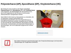 Die in der Tabelle aufgeführten Polyesterharze (UP), Epoxidharze (EP) oder Vinylesterharze (VE) werden vorzugsweise eingesetzt. Die Zusammensetzung der zur Anwendung kommenden Harzsysteme ist im Eignungsnachweis zu beschreiben. (Tabelle: Vorzugsweise eingesetzte Harzsysteme)