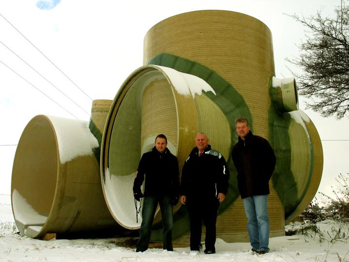 Planungsvorgabe: GFK statt Beton! Nach den Planungen von USS Consult wurde ein Stauvolumen von rund insgesamt rund 1120 Kubikmetern einschließlich der Möglichkeit eines Notabschlages mechanisch vorbehandelten Mischwassers den hydraulischen Anforderungen des Projektes gerecht. Dieses Stauvolumen wurde aufgeteilt in einen kleineren, konventionellen Staukanal DN 1600 mit 120 Kubikmeter Fassungsvermögen und in einen großen von 1000 Kubikmetern. Bei der Frage, wie der Stauraum technisch zu schaffen sei, bekamen die Planer durch die Gemeinde Berg als Auftraggeber eine klare Arbeitsvorgabe: Es sollte auf jeden Fall mit GFK-Rohren großer Nennweite gearbeitet werden, da man in den Vorjahren mit diesem Werkstoff hervorragende Erfahrungen bei Bau und Betrieb einer Bach-Verrohrung im Ortsteil Tiefengrün gemacht hatte. Des weiteren geht man von einer größeren Lebensdauer des korrosions- und abriebfesten GFK gegenüber Beton aus. Schließlich sprachen das Ausmaß und die Örtlichkeit des Stauraum-Projekts, ein sumpfiges Wiesengelände, gegen Beton. Während GFK-Rohre als Stauvolumen inzwischen nichts Ungewöhnliches mehr sind, werden zumindest die zugehörigen Sonderbauwerke zumeist noch immer herkömmlich in Ortbetonbauweise errichtet. In Berg aber setzten Auftraggeber und Planer auch in dieser Hinsicht voll auf GFK und die Möglichkeiten, die dieser vielfältig gestalt- und verarbeitbare Werkstoff kreativen Ingenieuren bietet.