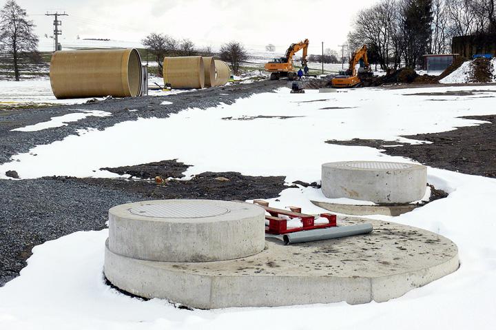 Herbst 2007: Warten auf „Bauwetter“ In Berg wurden im Herbst 2007 die ersten, jeweils 6 Meter langen FLOWTITE-Rohre DN 2900 angeliefert, ebenso das Zulaufbauwerk und das Entlastungsbauwerk, ein fünfeinhalb Metern hoher, mit allen Anschlüssen maßgefertigter Schacht DN 2900 mit innenliegendem Quelltopf. Der völlig verregnete Spätsommer und Herbst 2007 hatte die Baudurchführung in dem durchfeuchteten Gelände etwas zurückgeworfen. Da GFK-Elemente jedoch auch in dieser Größenordnung schnell und unproblematisch zu installieren sind, sind sich alle Beteiligten sicher, dass der weltweit einzigartige Kaskaden-Staukanal von Berg und die neue Kläranlage trotz der aktuellen Verzögerung pünktlich Anfang August 2008 für die Ortsteile Berg, Hadermannsgrün und Eisenbühl in Betrieb gehen werden.