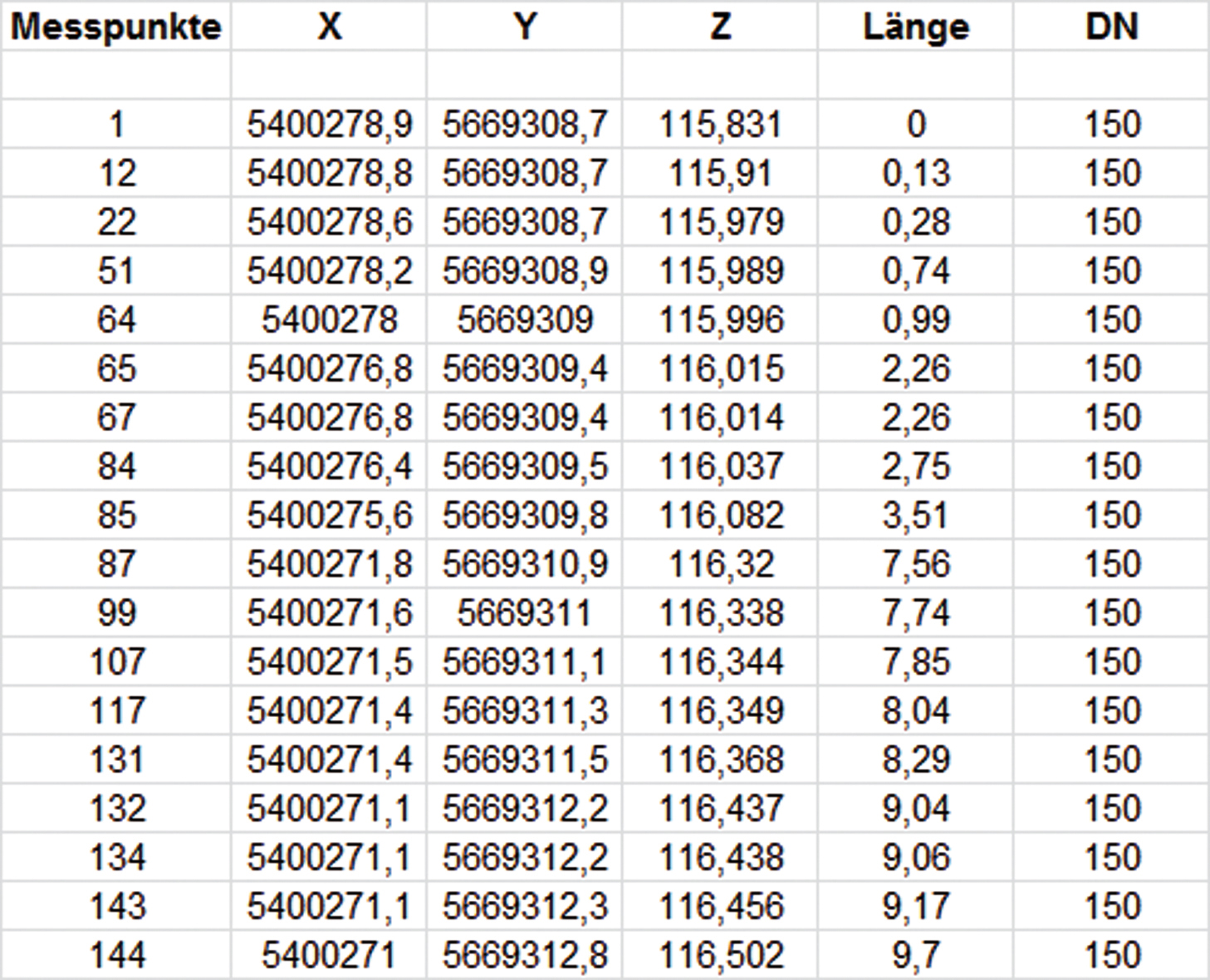 Die 3D-Darstellung wird durch Messpunktereihen gewährleistet. Speziell über die gerechneten Winkel- und Längenmessungen liefern die 2D-Projektionen in XY, XZ und YZ-Koordinaten Informationen für Hydraulik und Rückstauebene, sowie Unterbögen und Gegengefälle. Die Darstellung der Messpunkte mit Rechts- (Y) und Hochwert (X) sowie der Höhenvermessung (Z) und nachberechneter XY-bezogene Länge erfolgt über eine Tabelle.