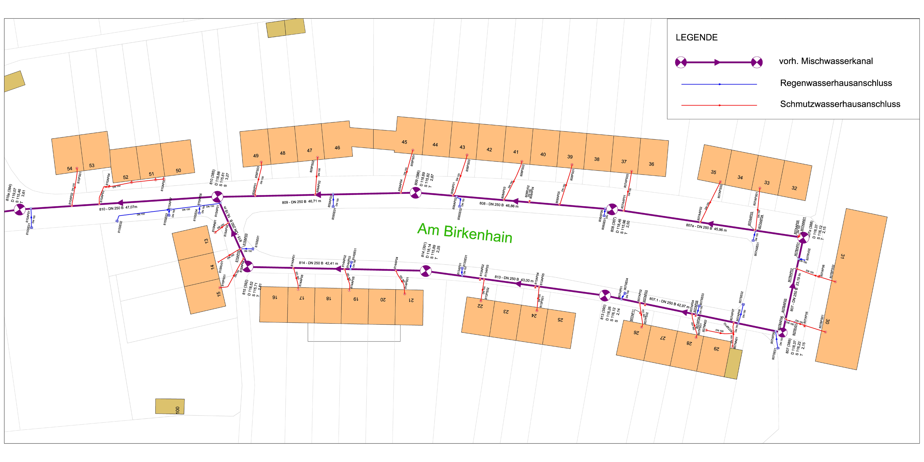 Gleich zu Beginn stellte sich die Frage, wie mit Hausanschlussleitungen umgegangen werden konnte, denn ihr Verlauf war nicht ausreichend dokumentiert: Eine TV-Befahrung des Hauptkanals gab Aufschluss über Lage und Anzahl der Anschlussstutzen. Nicht bekannt waren jedoch Verlauf und Zustand der Anschlussleitungen. Auch musste berücksichtigt werden, dass sich möglicherweise nicht alle Anschlüsse in Betrieb befinden. Unklar war ebenfalls, ob jedes Haus eine separate Anschlussleitung hat oder ob jeweils zwei Häuser an einer Leitung angeschlossen sind, worauf die Anzahl der Anschlussstutzen im Hauptkanal hindeuteten. Wie viele Leitungen waren also wo zu planen?