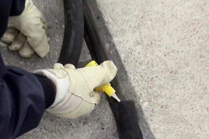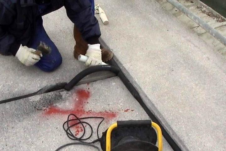 Zur Vermeidung von unzulässigen Dehnungen wird der Dichtstrang lose auf der Fuge ausgelegt und in Abständen von max. 30 x d (d = Profildurchmesser) punktuell in die Fuge eingebracht und damit an diesen Stellen befestigt. Das Profil wird dabei auf ca. 2/3 der endgültigen Einbautiefe eingebracht. Wenn diese Vorbefestigungen erfolgt sind, kann das Profil auf ganzer Länge bis auf die endgültige Tiefe eingebaut werden. Der Einbau der Profile kann per Hand oder maschinell erfolgen (s. Abb. 2 und 3). Verdrehungen müssen dabei unbedingt vermieden werden. Es muß weiterhin sichergestellt werden, daß auf 1,0 m Fuge auch tatsächlich 1,0 m Dichtungsprofil eingebaut wird und nicht durch Überdehnung beispielsweise nur 0,90 m (auf 1,00 m gestreckt) eingebaut werden. Dieses würde die Wirksamkeit der Kompressionsdichtung sehr stark beeinträchtigen.An Verbindungsstellen werden die Profile miteinander verklebt. Dabei müssen saubere, planebene und trockene Schnittstellen hergestellt werden. Die Enden der Profile müssen lose in Kontakt miteinander gebracht werden können, ohne dass eine Spannung entsteht. Eine Schnittfläche wird dünn mit dem Spezialkleber SICOMET 8300 eingestrichen und unmittelbar danach an die andere Schnittfläche herangeführt (Abb. 4). Die beiden Schnittstellen werden dann ca. 15 Sekunden lang stark aneinander gepresst, so dass eine einwandfreie Verklebung erfolgen kann. Der Klebstoff muß bei Temperaturen von max. 15 °C kühl gelagert werden.