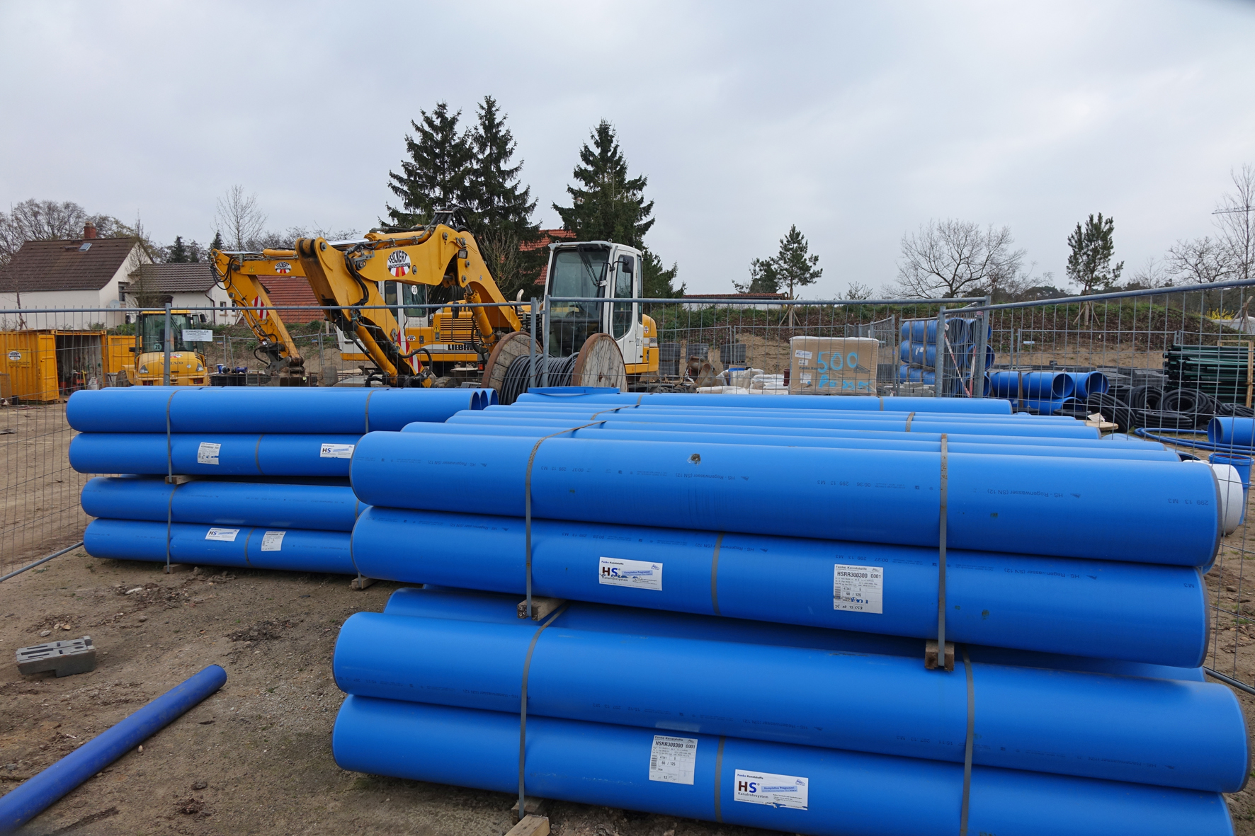 Auch Bauleiter Dipl.-Ing. Hubert Hartung von der Walter Feickert GmbH zeigt sich angetan von den Anschlüssen: "Dank der CONNEX-Anschlüsse konnten wir die spannungsfreien Hausanschlüsse sehr zeit- und kostensparend realisieren." Insgesamt verlegt wurden rund 2000 m Regenwasser- und Schmutzwassersammler mit HS®-Kanalrohrsystem blau (RW) und braun (SW) im Nennweitenbereich von DN/OD 250 bis DN/OD 630, zusätzlich wurden rund 300 m Hausanschlussleitungen verlegt. Hier kamen HS®-Kanalrohre DN/OD 160 in blau und braun zum Einsatz, die vom Sammler bis jeweils 1 m über die Grundstücksgrenzen hinaus verlegt und mit einem Revisionsschacht versehen wurden.