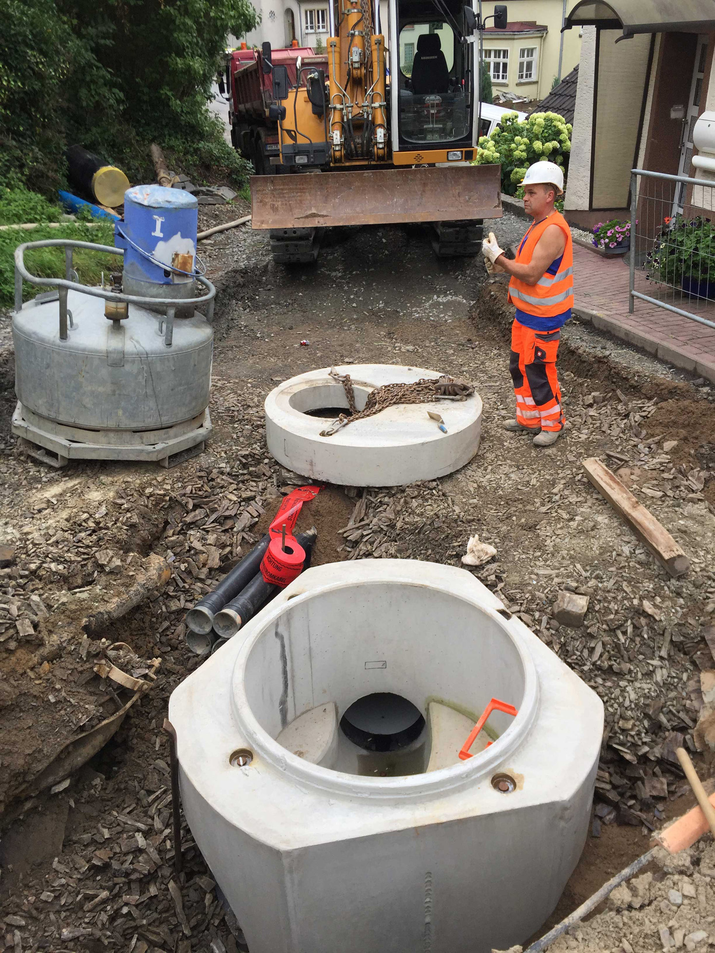 Das lokal ansässige Tiefbauunternehmen verfügt über jahrzehntelange Erfahrung im Tief- und Straßenbau und konnte seine Leistungsfähigkeit sowie Zuverlässigkeit bereits bei verschiedensten anspruchsvollen Baumaßnahmen in Altena unter Beweis stellen. Dass man auch trotz jahrzehntelanger Erfahrung nicht auslernt, zeigte sich insbesondere bei dieser Baumaßnahme, denn Erfahrungen mit dem Schweißen von Kunststoffrohren und Formteilen auf Basis der Heizwendelschweißtechnik gehörten bisher nicht zum Tagesgeschäft des Tiefbauunternehmens.