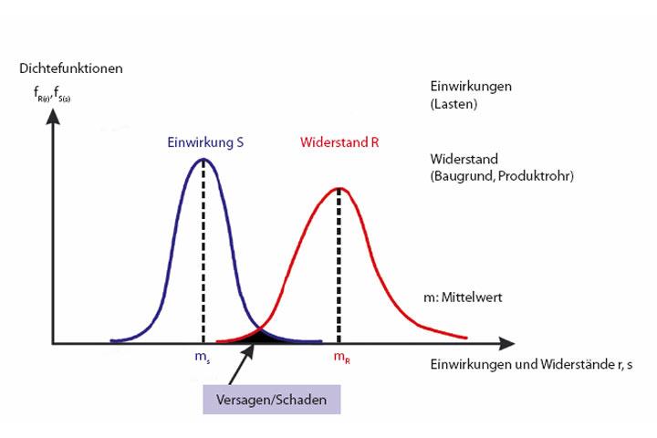 Bei allen Baumaßnahmen des Hoch- und Tiefbaues bestehen im Hinblick auf den Erfolg stets Risiken. Besonders hohe Risiken sind bekanntlich im Tunnelbau gegeben, wozu auch der Rohrvortrieb gehört. Risiko bedeutet in diesem Zusammenhang Wagnisse bzw. Gefahren, die infolge von Unsicherheiten und Unwägbarkeiten bei der Ausführung des Rohrvortriebes bestehen. Qualitativ kann das Risiko sehr wohl beschrieben werden. Im Hinblick auf die Quantifizierung des Risikos, das sich aus der Versagenswahrscheinlichkeit (Bild 1) und dem Schadensausmaß ergibt, bestehen Unwägbarkeiten jedoch allein unter Berücksichtigung der Baugrundverhältnisse, das heißt der Materialeigenschaften und deren Streuung, der Modellbildung des Baugrundes und der hierfür maßgeblichen Randbedingungen im Hinblick auf Geometrie, Berechnung und Bemessung und nicht zuletzt auch unter Berücksichtigung der Ausführungsart, der Ausführungsqualität, Überwachung usw.. Die Gründe für das Eintreten eines Schadens (Bild 2) sind vielfältiger Art. Sie können aber im wesentlichen wie folgt zusammengefasst werden: