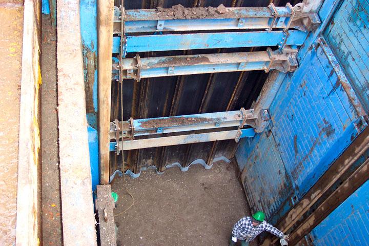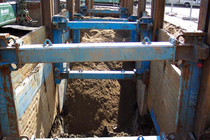 Auf kleineren Teilflächen mit Aushubtiefen von bis zu 8,50 m setzte das ausführende Unternehmen zwei Felder des Linearverbausystems mit einer Modullänge von jeweils 2,96 m ein. Die lichte Breite betrug 5,30 m, die Verbauwandhöhen erreichten 8,26 m. Kopfseitig wurden die Verbauelemente mit geführten Kanaldielen gesichert. Hierbei kam der E+S-Gurtungsträger zum Einsatz. Er wird im Profil des Linearverbauträgers geführt. Der untere Träger wird mit den Bauteilen des Verbausystems vormontiert. Beim Einbauen gelangt der Träger ungehindert in die vorgesehene Position. Er ist jederzeit in der Höhe verstellbar und schließt mit der kopfseitigen Kante des Linearverbausystems bündig ab. Wenn der obere Gurtungsträger nachträglich von oben eingebracht worden ist, können die Kanaldielen eingestellt werden.