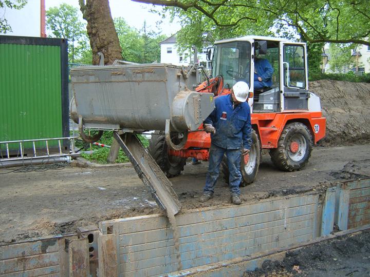 Wie an anderer Stelle über das F & E-Projekt berichtet, werden die optimierten Rohre (ND700) ohne Arbeitsraum direkt zwischen den Verbau verlegt. Hierbei wird nur die Rohrleitungszone mit einem von der Firma Wesser-Beton, Pölzig und Kronenberger entwickelten "Leichtflüssigboden" vergossen. Das Bindemittel steht auf Paletten als Sackware zur Verfügung. Mit einem Gödde-Anbaumischer wird die Vergussmasse, deren Zuschlagstoffe aus dem aufbereiteten Boden bestehen kann, nach Bedarf hergestellt und über eine Schurre in die Rohrleitungszone eingebracht. Die Erstarrungszeit ist relativ kurz einstellbar, so dass die Verfüllung des in diesem Falle 6 m tiefen Grabens ohne große Verzögerung durchgeführt werden kann.