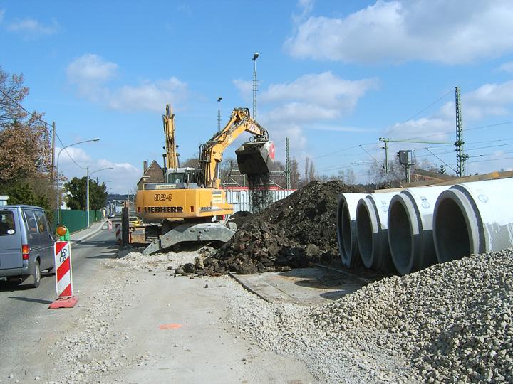 Zur gleichen Zeit führt die Fa. Teckenbrock, Dorsten, ein Kanalbauprojekt auch unter sehr beengten Verhältnissen in Essen Kupferdreh durch. Allerdings handelt es sich hier um Nennweiten von 1800 mm. Dass das Herstellen von Bodenbaustoff bei Erschließungsarbeiten von Wohn- und Industriegebieten problemlos ist, bedarf wohl keiner besonderen Erwähnung.