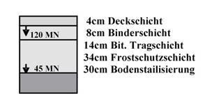 Bei früher durchgeführten Projekten ähnlicher Art, wurden bei entsprechender Vorgehensweise mit ca. 2 % Mischbindezugabe Ev2 von 120 bis 140 MN/m2 erreicht, womit die jeweils geforderten 80MN/m2 bei weitem überschritten wurden.