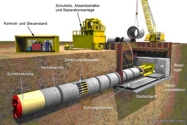 Die Verlegung der Fahrrohrleitungen erfolgt grabenlos (unterirdisch) nach dem Prinzip des Rohrvortriebs (Stein 2003). Dabei werden von einem Startschacht aus mit Hilfe einer Hauptpressstation und im Rohrstrang positionierter Zwischenpressstationen vorgefertigte Vortriebsrohre durch den Baugrund bis in einen Zielschacht vorgetrieben. Der anstehende Boden oder Fels wird an der Ortsbrust mechanisch abgebaut und durch den vorgetriebenen Rohrstrang nach über Tage abgefördert. Eine steuerbare Schildmaschine, die dem ersten Rohr vorgeschaltet ist, ermöglicht den genauen Vortrieb in gerader oder gekrümmter Linienführung (Abb. 4).
