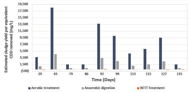 One benefit of Aquacycl BETT system is the limited biomass production. During sugarwater treatment the BETT Demo Unit only generated 0.03 to 2.5% biomass from the COD removed (Table 1). In comparison to other conventional technologies, this translates to negligible biomass production (Fig. 3). The biomass generated from BETT ranged between 4 to 112 mg/L VSS compared to 381 to 4,615 mg/L VSS if the wastewater was anaerobically treated; and 1,522 to 18,462 mg/L VSS for aerobic processes (assuming identical COD loading in all cases). The Net Energy Recovery (NER) from BETT was up to 1.6 kWh/ kg-COD removed comparable to anaerobic digestors combined with methane conversion to electricity. The electricity was generated as direct DC power, with no intermediate methane production.