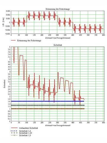 Ein typisches Ergebnis der Simulation ist im Bild 6 dargestellt. Das obere Diagramm zeigt zur Orientierung den Trassenverlauf in Form des Krümmungsbandes über die gesamte Vortriebsstrecke. Das untere Diagramm dokumentiert für eine konstant angenommene Vortriebskraft das Sicherheitsniveau bezüglich der Rohrbeanspruchung für Einwirkungen in Richtung der Rohrachse. Deutlich zeigt sich der erhebliche Einfluss der zunehmenden Verhärtung des Druckübertragungsringes. Mit jeder Versteuerung sinkt das Sicherheitsniveau, das zu Beginn der ersten Kurve noch über zwei liegt und am Ende der zweiten Kurve bei gleicher Vortriebskraft und gleicher Abwinkelung bis auf 1,3 absinkt. Das Phänomen der Verhärtung des Druckübertragungsringes birgt somit erhebliche Gefahren hinsichtlich einer Überbeanspruchung der Rohrbetons insbesondere