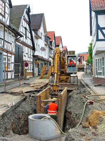 Im Zuge dieser Aus- und Umbaumaßnahmen werden von März bis September dieses Jahres im Bereich Mittelstraße, Kirchgasse und Schulgasse 455 m Mischwasserkanal in der Nennweite DN/OD 315 erneuert. Auftraggeber und Planer haben sich erstmals für den Einsatz von CONNEX®-Kanalrohren entschieden. "Neben dem guten Preis-Leistungsverhältnis waren es vor allem bautechnische Gründe, die bei der Wahl des Rohres eine Rolle gespielt haben", erinnert sich Dipl.-Ing. Klaus Dieter Dolk, Ingenieurbüro Bick. Darüber hinaus erklärte der Hersteller sich sofort bereit, die gewünschte Baulänge von 2 m als Sonderanfertigung zu produzieren. Das hat sich bezahlt gemacht: "Die kurzen Rohre harmonieren perfekt mit den eingesetzten Verbaumodulen", so Dolk weiter. "Zudem sorgen vor allem das niedrige Gewicht des Rohres und die einfache Steckmuffenkonstruktion für rationelles Arbeiten und einen zügigen Baufortschritt." Eine wichtige Voraussetzung bei den Tiefbauarbeiten in der Altstadt von Zierenberg. Das ausführende Unternehmen arbeitet sich mit möglichst kurzen Haltungen durch die