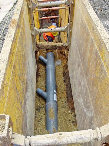 Mit dem 45°-Standardabzweig DN/OD 315/160 werden die mehr als 100 Hausanschlussleitungen eingebunden. Auch hier kommt mit dem HS®-Kanalrohrprogramm ein Produkt von Funke zum Einsatz. Sämtliche Bauteile des Rohrsystems sind ebenfalls wandverstärkt. So halten Rohre und Formstücke starke Druckbelastungen aus und sind bereits bei Überdeckungen von 0,5 - 0,6 m für Verkehrslasten bis SLW 60 einsetzbar. Die gemessene Ringsteifigkeit liegt bei 12KN/m2. Die gute Hydraulik und die absatzfreien Verbindungen fördern eine sichere Wasserableitung. Die wurzelfesten und wurzeldichten Rohrverbindungen sind schlagzäh und lassen sich schnell und einfach einbauen. Das gesamte Rohrsystem erfüllt die erhöhten Anforderungen der ATV A 142 - druckdicht bis 2,5 bar - und ist somit auch in wassergewinnungsgebieten der Zone II/III einsetzbar. Außerdem fällt bei der Verlegung kein Abfall an. Da die Rohre muffenlos gefertigt und die Rohrverbindungen mit speziellen Doppelmuffen hergestellt werden, können die Abschnitte weiterverarbeitet werden.