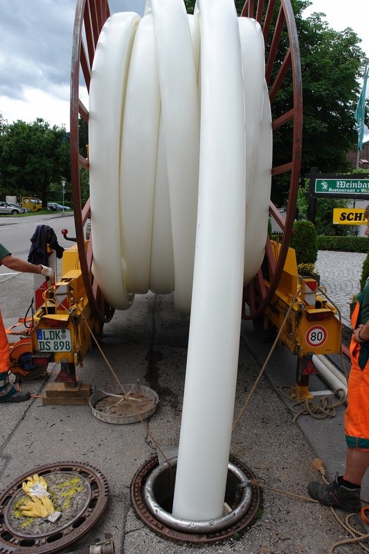 Während der Regenwassersammler im Berstlining-Verfahren erneuert wurde, setzte der Auftraggeber bei der Sanierung des Abwassersammlers aus bautechnischen und wirtschaftlichen Erwägungen auf eine Auskleidung im Close-fit-Lining-Verfahren. Zur Anwendung kam das Compact-Pipe-System, das von den Sanierungsprofis der DIRINGER&SCHEIDEL ROHRSANIERUNG GmbH & Co. KG, Niederlassung München, eingebaut wurde. Dabei wird ein werkseitig C-förmig vorverformtes HDPE-Rohr in die gereinigte Haltung eingezogen. Druck und Wärme sorgen dann beim weiteren Arbeitsablauf dafür, dass der Inliner sich durch den so genannten Memory-Effekt close-fit an die Innenwandung des alten Rohres legt. Das Ergebnis ist ein statisch eigenständiges und belastbares Rohr, das in Bezug auf die Qualität mit einer Neuverlegung vergleichbar ist. Zu den weiteren Vorteilen zählt neben der kurzen Einbauzeit der Umstand, dass sich die Beeinträchtigungen für die Anwohner sowie den Fußgänger- und Straßenverkehr in akzeptablen Grenzen halten – ein Aspekt, der vor allem in Hinblick auf den Fremdenverkehrscharakter des Kur- und Urlaubsortes Bad Wiessee eine wichtige Rolle spielte.
