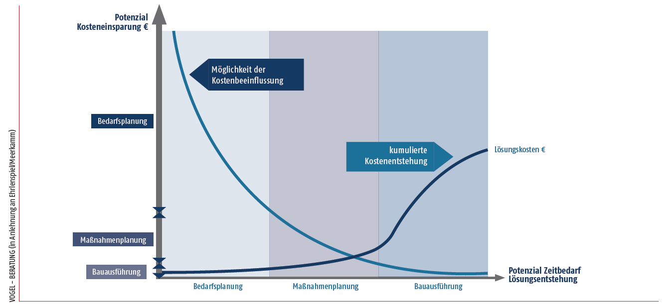 Die strategisch orientierte Ermittlung des entstehenden Sanierungsbedarfs im kommunalen Anlagen- und Infrastrukturbestand wird hinsichtlich deren Bedeutung für eine nachhaltige, wirtschaftliche Aufgabenerfüllung bis heute in vielen Kommunen nicht hinreichend wahrgenommen. Die in Abbildung 1 dargestellten Gesetzmäßigkeiten zeigen unverkennbar, dass die Weichen zur wirtschaftlichen Lösungsentwicklung bereits im Stadium der Bedarfsplanung (als originäre Bauherrenaufgabe) gestellt werden. Kommt es in dieser Phase zu falschen Zieldefinitionen, können an sich bestehende Kosteneinsparpotenziale im späteren Verlauf nicht mehr erreicht werden. Das technische Regelwerk für die Planung bildet diesen Sachverhalt in der gesamten Prozesstiefe vollständig ab.