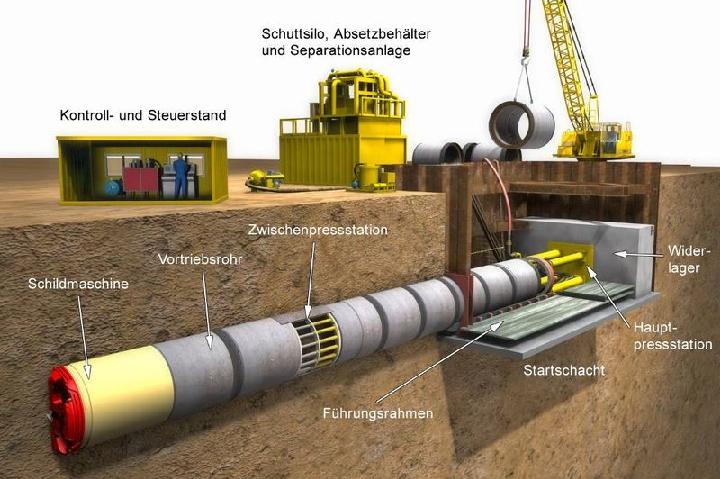Bei der Verlegung der Fahrrohrleitung kommt der bewährte grabenlose Rohrvortrieb zum Einsatz. Diese Bauverfahrenstechnik ist Stand der Technik und wird heute beim Bau von Kanälen, die beispielsweise der Führung von Abwasser dienen, eingesetzt. Dabei werden von einem Startschacht aus mit Hilfe einer Hauptpressstation vorgefertigte Vortriebsrohre durch den Baugrund bis in einen Zielschacht getrieben, der nach derzeitigem Stand bis zu 1.200m entfernt sein kann. Der Boden oder Fels wird mechanisch abgebaut und durch das vorgetriebene Rohr nach über Tage gefördert. Die dem ersten Rohr vorgeschaltete Schildmaschine ermöglicht den genauen Vortrieb in gerader oder gekrümmter Linienführung (vergleiche Abbildung 4). [SSB+09]4. Technische Beschreibung