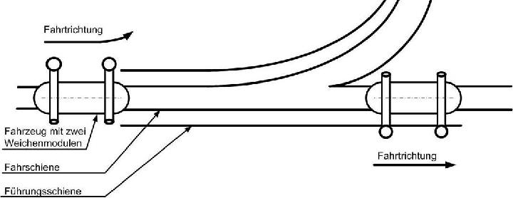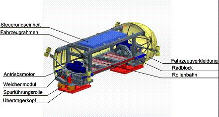 Laufrollen übernehmen die Tragfunktion der Fahrzeuge auf der Schiene, seitliche Spurführungsrollen stellen ihre Führung im Fahrweg sicher. Jede der Laufrollen wird durch einen Synchronmotor angetrieben. Diese Elektromotoren sind in großer Vielfalt am Markt verfügbar und technisch ausgereift. Zusätzlich gewährleistet das gewählte Antriebskonzept mit auf alle Räder verteilten Motoren eine optimale Traktion bei hoher Betriebssicherheit.