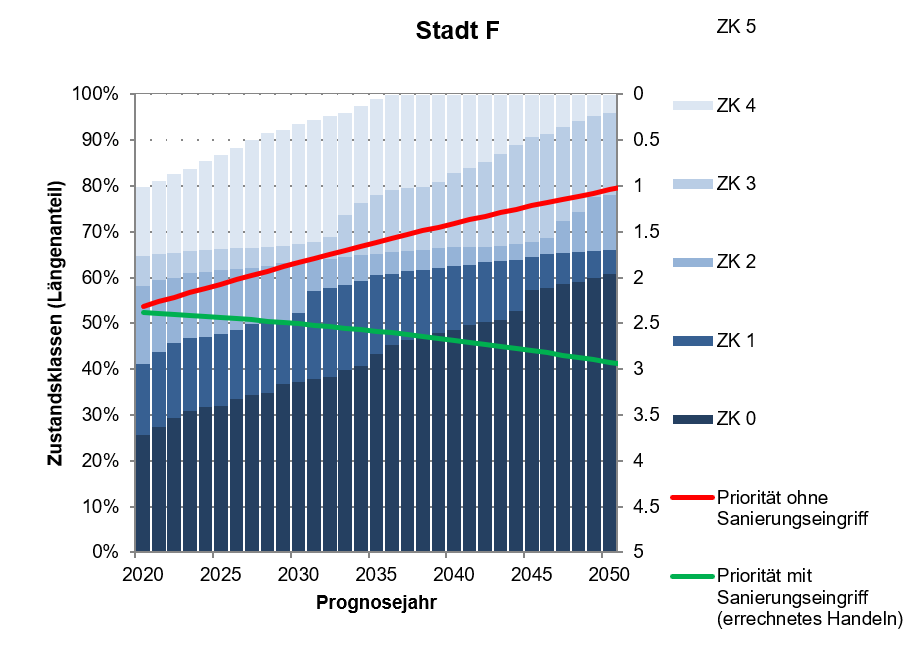 Der Anteil von ZK0 beträgt im Jahr 2020 ca. 25 % und erhöht sich bei ungestörter Netzalterung auf ca. 60 %. Ergänzend ist auch die durchschnittliche Entwicklung der Sanierungspriorität sowohl ohne Sanierungsintervention (rot) als auch mit Fortführung der aktuellen Sanierungsaktivitäten (grün) dargestellt. Im Jahr 2020 liegt der Mittelwert der Sanierungspriorität bei ca. 53 %. Ohne Sanierungsintervention wächst dieser innerhalb von 30 Jahren um 27 %, steigt also auf 80% an. Demgegenüber reduziert sich die mittlere Sanierungspriorität bei Fortführung der Sanierungsaktivitäten (grün) in 30 Jahren um ca. 13 %. Unter Berücksichtigung der prognostizierten Zustandsklassenentwicklung reduziert sich die mittlere Sanierungspriorität sogar um 40 %. Damit wird nahezu die prognostizierte Zunahme der Schadensklasse ZK0 kompensiert.