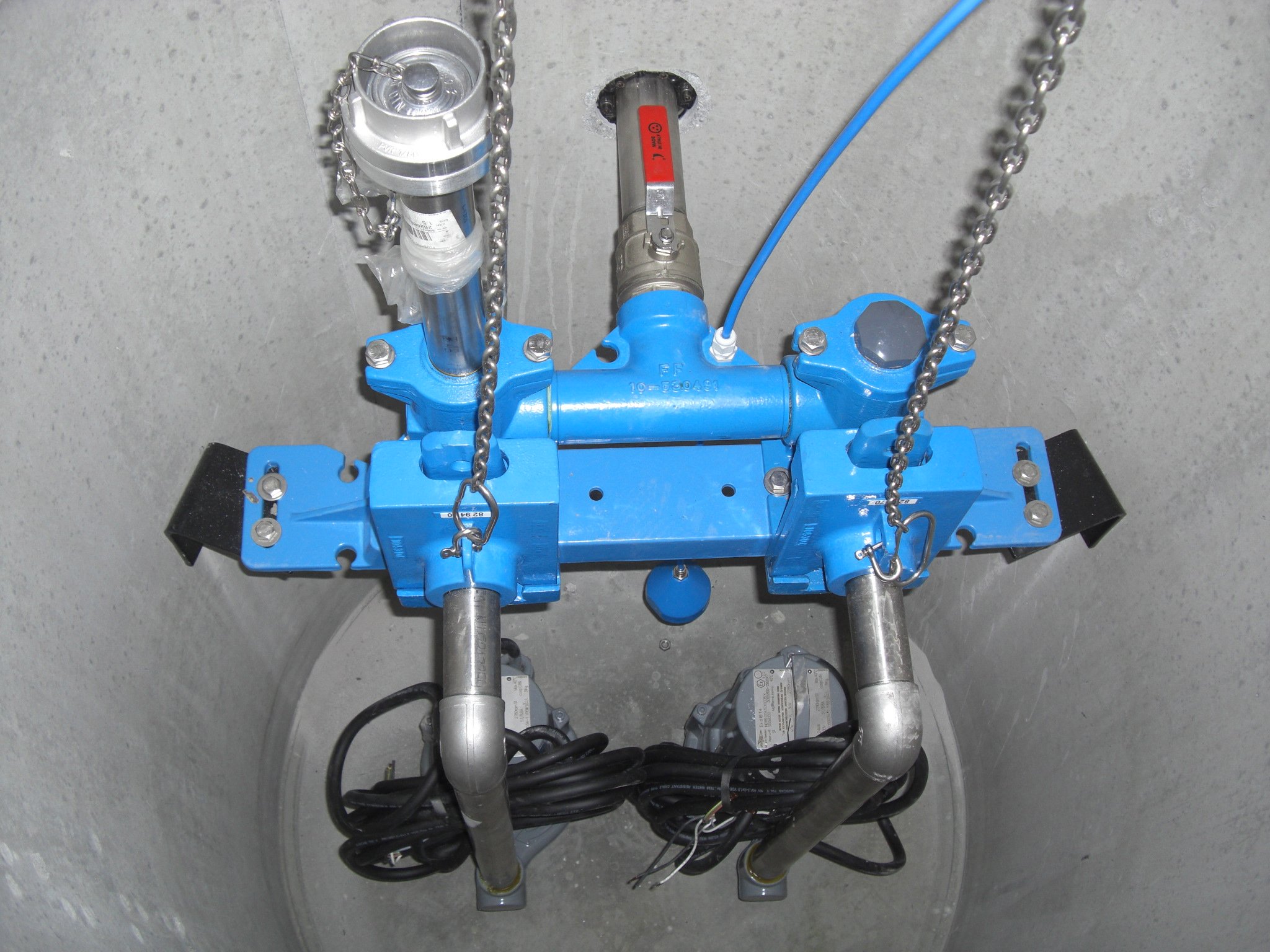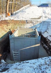 Um kleinere Abwassermengen aufzunehmen, die beispielsweise beim Wechsel von Armaturen anfallen können, befindet sich im Boden der Trockenkammer ein Pumpensumpf. Dessen Inhalt befördert eine Kellerentwässerungspumpe bedarfsweise zurück in die Saugkammer. Da Pumpentechnik und Verrohrungen werkseitig bereits vormontiert waren, hat der Einbau des Fertigteilbauwerks nur kurze Zeit in Anspruch genommen.