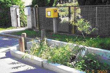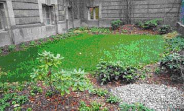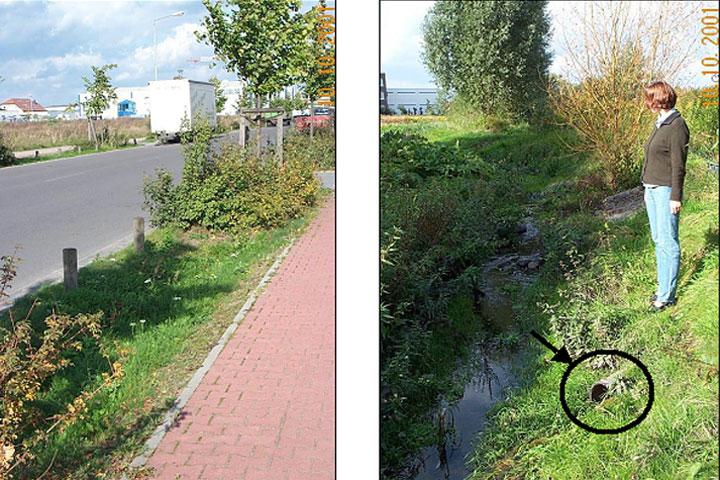 Abbildung 5 zeigt ein straßenbegleitendes Mulden-Rigolen-System aus dem Gewerbegebiet Dahlwitz-Hoppegarten bei Berlin (linkes Bild) sowie den Auslauf in den Vorfluter, an den ca. 80 ha (!) versiegelte Fläche angeschlossen sind.