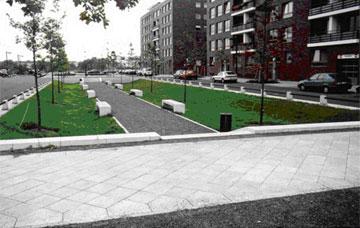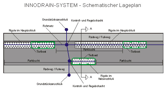 In städtischen Gebieten ist die für Versickerungsanlagen zur Verfügung stehende Flächen oft begrenzt. Beim Innodrain-System werden deshalb die Versickerungsmulden durch Beton-Rahmen-Elemente, sogenannte Tiefbeete, eingefasst (Abbildung 6). Die sonst üblichen Kiesrigolen werden durch Kunststofffüllkörper ersetzt. Hierdurch kann der Flächenbedarf bei gleicher Überstauhäufigkeit halbiert werden. Die wechselseitige Anordnung im Straßenraum ermöglich außerdem einen verkehrsberuhigenden Effekt (Abbildung 7).