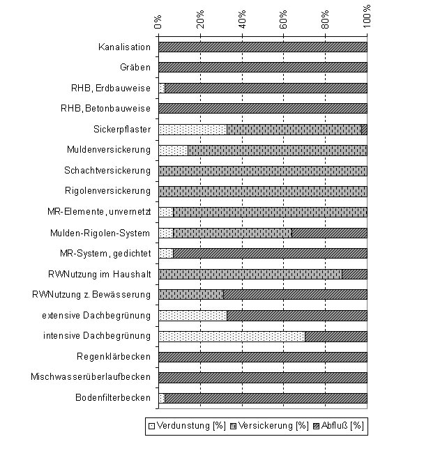 Jede Form der Entwässerung hat zwangsläufig einen Einfluss auf den Wasserhaushalt eines Gebietes. Um einen groben Überblick über die Wirkung zu bekommen, werden in Abbildung 8 verschiedene Regenwasserbewirtschaftungsmaßnahmen vergleichend gegenüber gestellt.