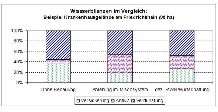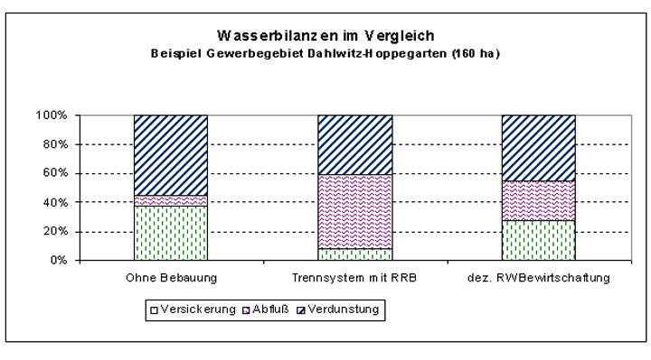 Abbildung 9 zeigt die langjährige Wasserbilanz für ein Gewerbegebiet in der Nähe von Berlin. Das Gebiet hat eine Größe von 100 ha und ist zu 80% versiegelt. Der Boden ist durch stark lehmigen Geschiebemergel mit kf-Werten um 10-7 m/s charakterisiert. Die Säule "dez. RWBewirtschaftung" stellt die realisierte Variante dar: ein Mulden-Rigolen-System sowohl für private Grundstücke als auch für Straßenabflüsse. Die Anlagen sind seit ca. 1995 in Betrieb. Das für die Modellierung der Wasserbilanzen verwendete N-A-Modell wurde an Messungen kalibriert [PANNING, 2002].