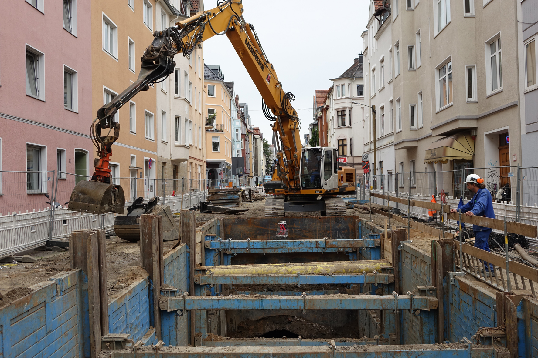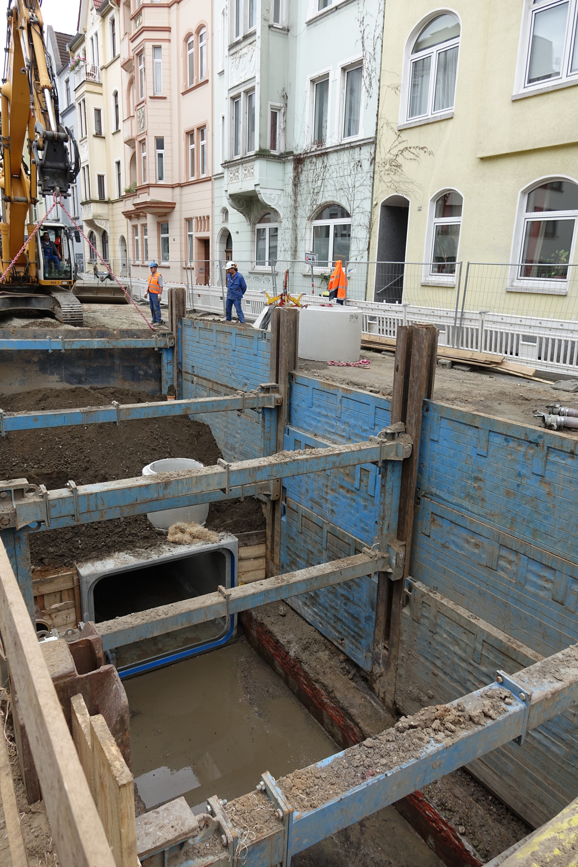 Mit der Planung und Ausführung der in offener Bauweise durchzuführenden Sanierungsarbeiten beauftragt wurden die auf Ingenieurplanung im Kanalbau spezialisierte Borkener H+S GmbH & Co. KG und die ebenfalls in Borken ansässige Klaus Stewering Bauunternehmung GmbH & Co. KG. Für die Sicherung der 5 m breiten und 5,50 m tiefen Baugruben im engen Altstadtbereich von Bielefeld setzt das Tiefbauunternehmen den gestuften Linearverbau von Emunds+Staudinger ein, einer Produktmarke der thyssenkrupp Infrastructure. Neben wirtschaftlichen Vorteilen kann das Verbausystem auf der Baustelle vor allem seine technologischen Stärken ausspielen – und das sowohl in der Handhabung bei Ein- und Ausbau als auch mit Blick auf die statische Leistungsfähigkeit hinsichtlich der engen Wohnbebauung und des breiten Querschnittes der Baugrube.