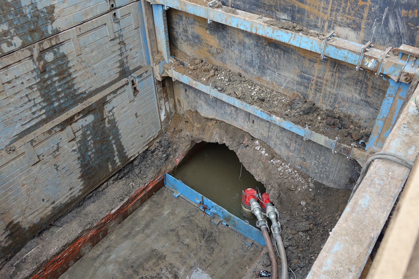 Zur Sicherung der 5 m breiten und 5,50 m tiefen Baugrube setzt die Bauunternehmung auf den Linearverbau von Emunds+Staudinger – „eine Lösung, die sich im Vergleich mit verschiedenen Alternativen als die wirtschaftlichste Option erwiesen hat“, wie Heitkamp betont. Außerdem sind die Anforderungen, welche die Verhältnisse vor Ort an den Verbau stellen, hoch. „Der Einbau großer Profile (2,90m x 2,35m) erfordert einen großen Querschnitt der Baugrube und damit auch den Einsatz von schwerem Gerät“, erklärt Stewering-Polier Frank Stenert. „Zudem liegt der Grundwasserspiegel neben dem Kämpfer, sodass wir das Grundwasser während der Baumaßnahme fassen müssen“, so Stenert.