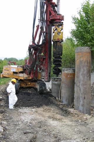 Da der Lärmschutzwall zu großen Teilen aus Müll bestand, wurde im Vorfeld ein Bodenaustausch bis unterhalb der späteren Rohrtrasse durchgeführt. Hierzu wurden in Dammlängsrichtung ca. 188 überschnittene Kiespfähle bis zur Oberkante der vorhandenen Tonbasisabdichtung hergestellt. Die Pfähle mit einem Durchmesser von 90 cm wurden im unteren Bereich mit Filterkies der Körnung 2/8 und im darüber liegenden Teil mit der Körnung 16/32 verfüllt. Im zweiten Schritt war geplant, am Fuß der Kiespfähle eine Drainageleitung zu verlegen, um das anfallende Sickerwasser hieraus abpumpen zu können.