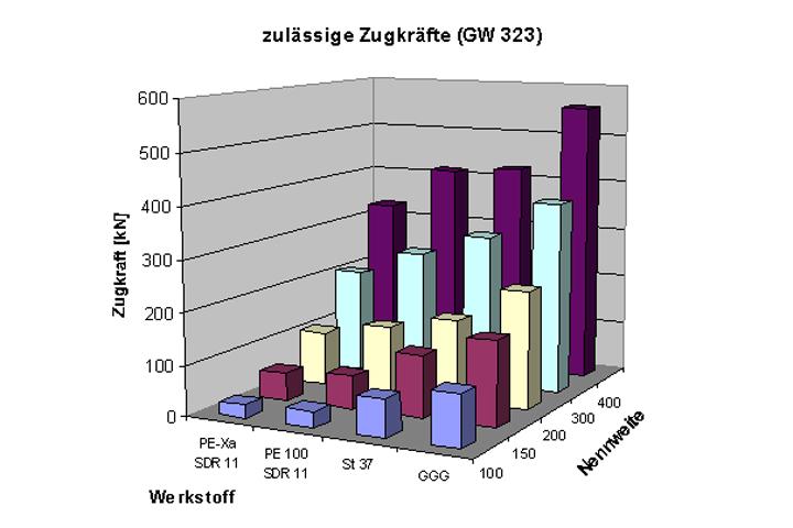 Die maximal zulässigen Einzugkräfte sind ebenfalls dem o.a. DVGW-Arbeitsblatt (Anhang A, Tabelle 6a) zu entnehmen. Die höchsten Werte der für Wasserleitungen üblichen Rohrwerkstoffe sind den zugfesten Verbindungen duktiler Gussrohre zugeordnet (Bild 6). Diese Verbindungen sind so weit abwinkelbar, dass sich damit extrem kleine Kurvenradien ausführen lassen. In der Kombination von kürzester Montagezeit der Verbindungen, höchster Zugkräfte und kleinster Inanspruchnahme von Baustellenfläche liegt der größte Vorteil dieses Werkstoffes: die Baugruben sind extrem klein und können mit größtmöglichen Abständen angeordnet werden. Unmittelbar nach der Montage können die vollen Zugkräfte unabhängig von der herrschenden Außentemperatur ohne weitere Wartezeit aufgebracht werden.
