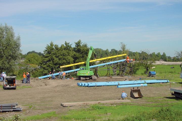 In den Niederlanden mit ihren schwierigen Baugrundverhältnissen und ihrem dichten Infrastrukturnetz hat der Einbau duktiler Gussrohre mit dem Horizontalspülbohrverfahren eine rasante Entwicklung durchlaufen: eine Reihe von rekordverdächtigen Projekten fand im Jahr 2002 ihren Höhepunkt mit der in [2] beschriebenen Maßnahme 210 m DN 700. Eine speziell holländische Variante der Bauversicherung besteht in der Forderung der Versicherer, das Leitungsstück vor dem Einzug in den Bohrkanal zusammenzubauen und mit Wasserdruck vorzuprüfen. Bei großen Nennweiten und langen Teilstücken führt diese Forderung zu Mehrkosten wegen erhöhtem Platzbedarf und zusätzlicher Bauzeit.