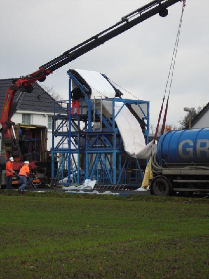 3 Wasser für den 2. Schlauch wurden jeweils in kürzester Zeit für die Inversionen benötigt. Das zusätzlich benötigte Wasser musste daher von 2 Sattelaufliegern "just in time" auf der Baustelle angeliefert werden. Das Aufheizen des Wassers mit Hilfe von drei mobilen Heizanlagen dauerte ca. 10 Stunden, die eigentliche Inversionen rund 6 Stunden. Ca. 10 Stunden muss die Prozesstemperatur von 80 °C gehalten werden, bis der Aushärtevorgang vollständig abgeschlossen ist. Das abgekühlte Prozesswasser konnte dann in einen 200 m entfernten Mischwasserkanal gepumpt werden. Der Aushärtvorgang wurde nach Vorgaben des Auftraggebers exakt kontrolliert und dokumentiert. Der genaue Temperaturverlauf während der Aufheiz- und auch der Abkühlphase wurde messtechnisch erfasst und dokumentiert. Im Bereich des Start- und Zielschachtes wurden Thermofühldrähte positioniert, mit denen die Temperatur beim Aufheizen und Aushärten des Schlauches gemessen wurde.